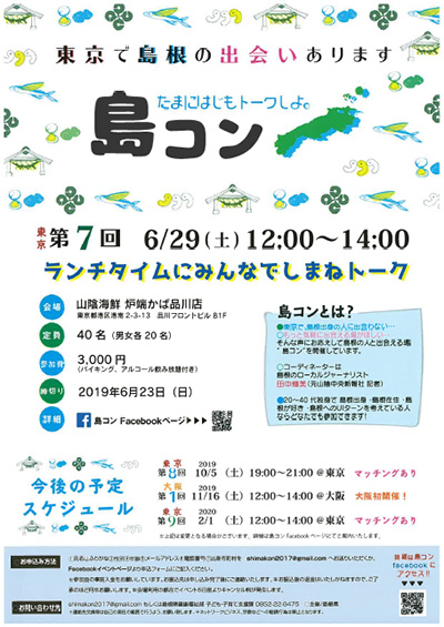 | 行事等の概要(掲載内容) | 必ず詳細情報をご確認ください。 【島根県HP】/ 【facebook】 ![]() 「東京で島根出身の人に出会わない…」 「もっと気軽に出会える場がほしい!」 そんな声にお応えして今年も 『島コン!』 を開催します。 会場は島根県民おなじみ、炉端かばの品川店です。 コーディネートは『関係人口』で注目を集める田中輝美さん! |