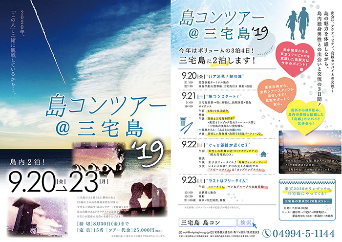 | 行事等の概要(掲載内容) | 詳細情報(PDF) 三宅島の人と暮らしに興味のある20歳以上の島外独身女性を対象に、三宅島で「島コンツアー」を開催します!島の自慢であるドラマチックな景色があなたの運命の出会いを盛り上げます。 参加にあたっては、必ず詳細情報をご確認ください |