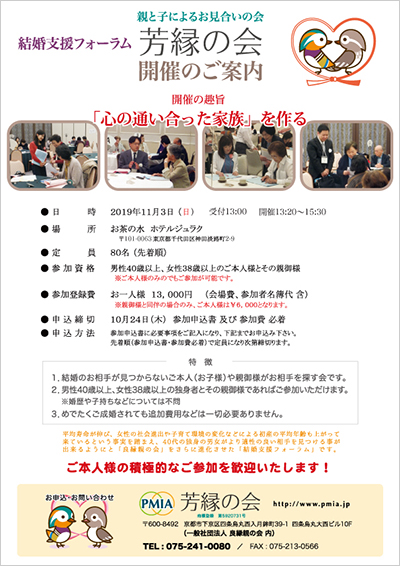 | 申込方法: ①まずは開催概要の資料をご請求ください。 TEL:075-241-0080 もしくは、次のフォームよりhttps://form.run/@pmia ②郵送にて資料一式をお送りします。 ③お送りした資料に入っている「参加申込書」に全てご記入のうえ、締切日(10月24日)迄に以下の申込先に郵送にて申し込んでください。 [申込先] (一社)良縁親の会 〒600-8492 京都市下京区四条烏丸月鉾町39-1 四条烏丸大西ビル10F TEL:075-241-0080/FAX:075-213-0566 |