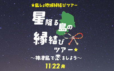 | 行事等に係る問合せ・申込先 | (株)近畿日本ツーリストコーポレートビジネス トラベルサービスセンター東日本 『星降る島の縁結びツアー ~神津島で恋をしよう~』事務局 〒160-0023 東京都新宿区西新宿8-14-24 西新宿KFビル3階 TEL:0570-064-826 FAX:03-6730-3230 |
