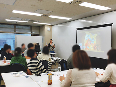 13:00~14:35 ワークショップ 交流イベント前に男女合同の婚活ワークショップを開催。理想のパートナーを引き寄せるためのノウハウを楽しく学んでいただきました。 15:00~16:40 バブルサッカー バブルボールを身につけてサッカーをする「バブルサッカー」。男女混合のチームでメンバー同士、協力しながら楽しくご参加いただきました。 17:10~19:00 お食事・交流会/カップル発表 セミナー・バブルサッカーを通じて、すっかり緊張もほぐれ、和やかな雰囲気の中でお食事・交流を楽しんでいただきました。 詳細はこちら |