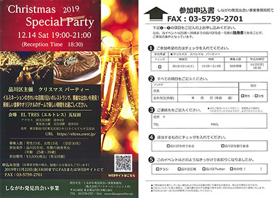 | 行事等の概要(掲載内容) | イルミネーションのきれいな目黒川沿いのレストランで、素敵な出会いを発見! 美味しい食事やオリジナルのゲームで楽しい時間をお過ごしください。 詳細情報(PDF) ![]() ご参加にあたっては必ず添付の詳細情報(PDF)の内容をご確認ください。 |