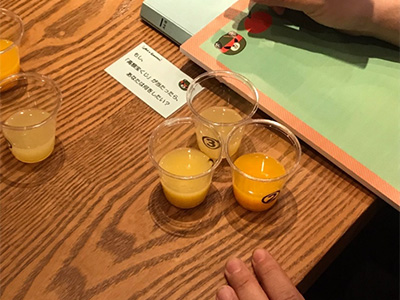 ・「温州みかん」「河内晩柑」「いよかん」の3種類の柑橘ジュースを、種類がわからない状態で参加者の方に飲んでもらい、『「河内晩柑」ジュースは何番だったか』というゲームを実施しました。正解者には、景品(みかんジュース)のプレゼントを行いました。