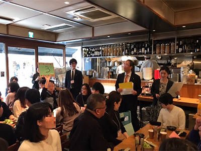 ・3テーブルに分かれて行った、「みかんジュース飲み比べゲーム」により、参加者の緊張がほぐれ、一気にイベントが盛り上がりました。