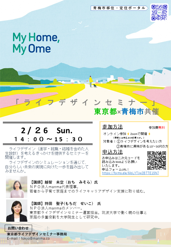 | 開催の趣旨・目的 | 東京都・青梅市の共催により、ライフデザイン(進学・就職・結婚を含めた人生設計)を考えるきっかけを提供するセミナーを開催します。 ライフデザインのシミュレーションを通じて、自分らしい未来の実現に向けた一歩を踏み出してみませんか。 |