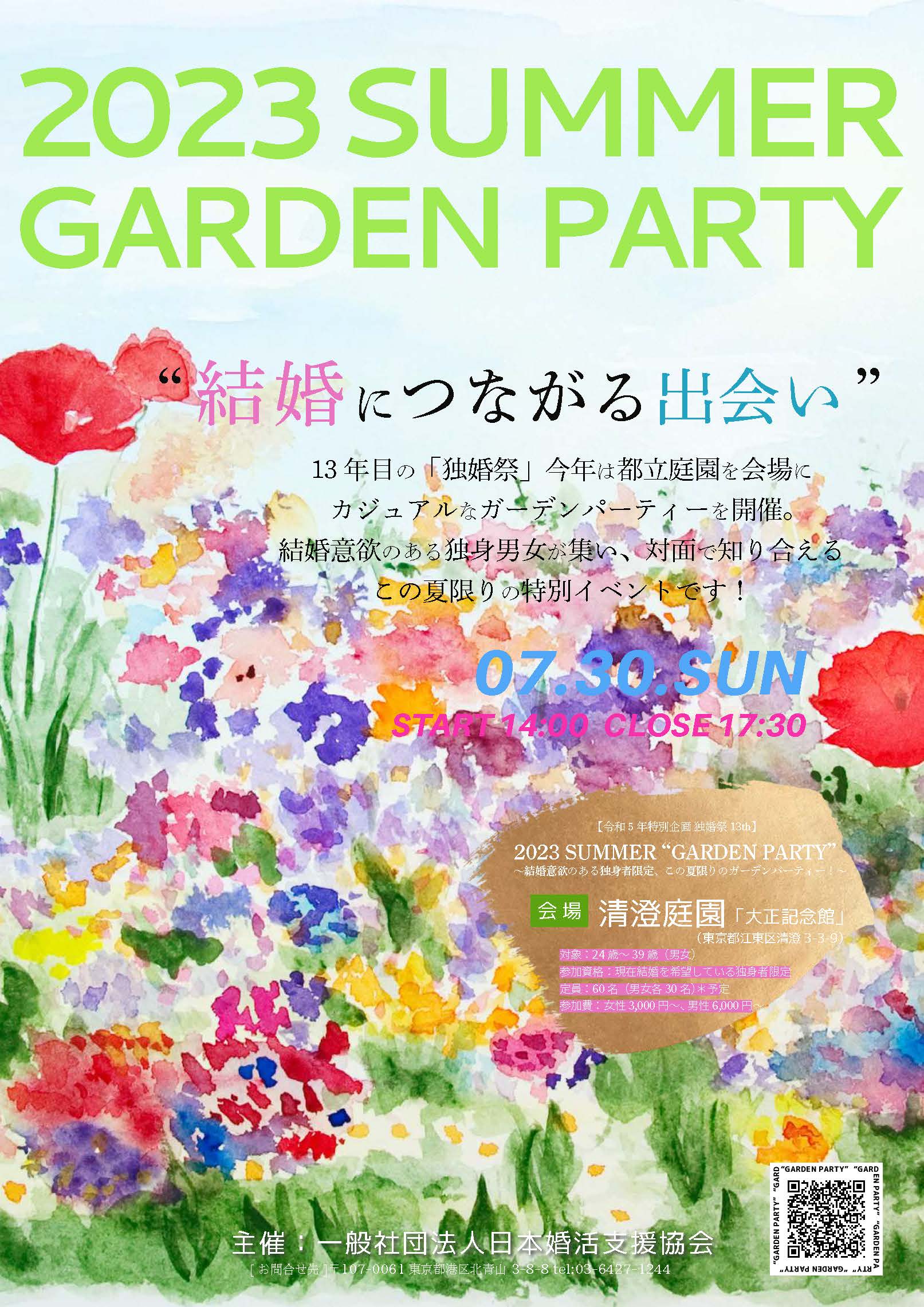 | 開催の趣旨・目的 | 婚活協会が主催する結婚につながる出会いを本気で応援する婚活イベント「独婚祭」は今年で13年目の開催になります。東京都の名勝に指定されている日本庭園「清澄庭園」の園内にある集会施設を会場に、庭園を眺めながら、散策しながら、結婚意欲のある独身男女が集い、対面で知り合える、この夏一日限りの“新しい出会いの機会”を提供します。 | ||