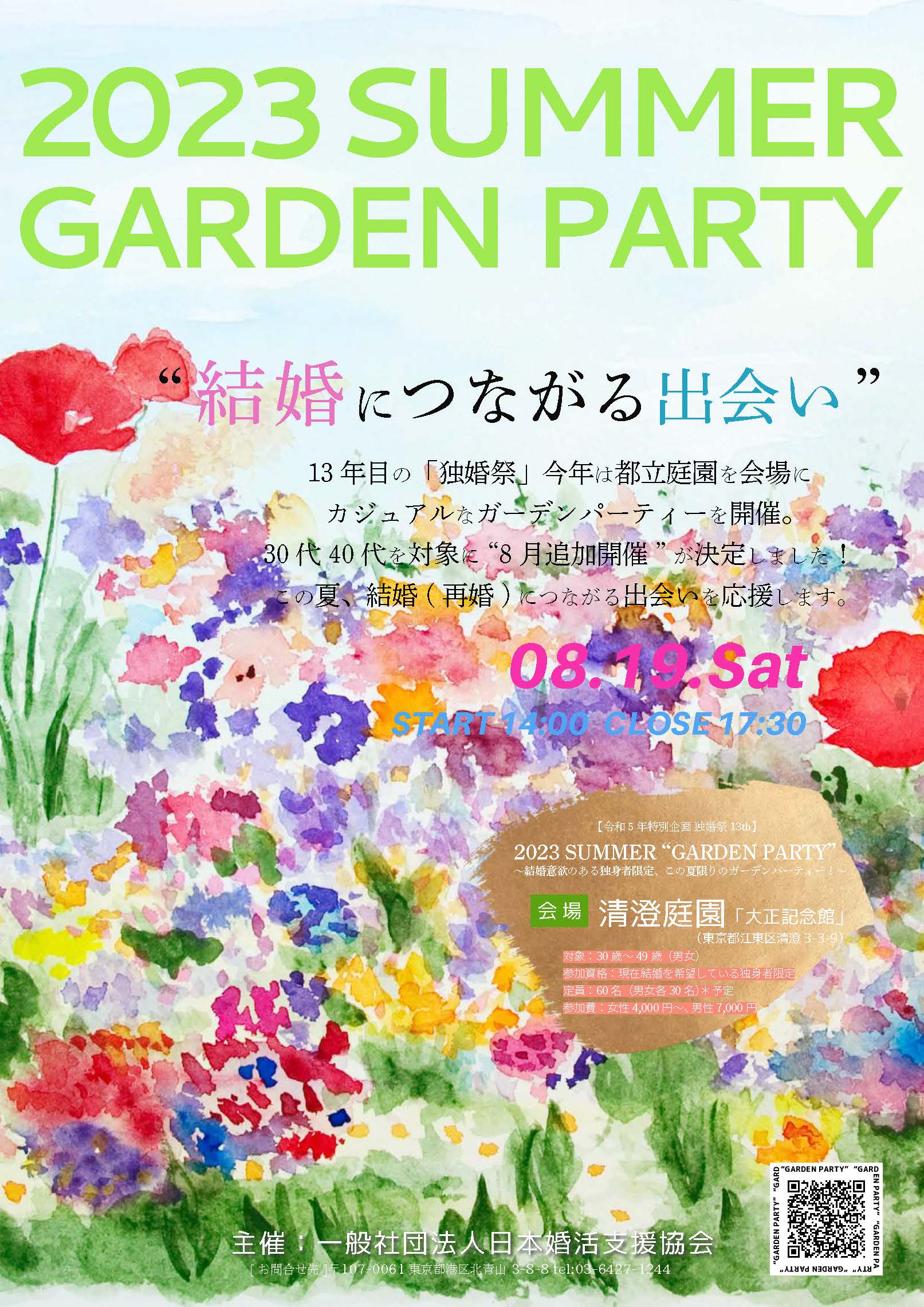 | 開催の趣旨・目的 | 結婚につながる出会いを本気で応援する婚活イベント「独婚祭」。多数のご要望をいただきましたので、30代40代を対象に “8月追加開催” が決定しました!都立庭園を会場に、この夏、結婚(再婚)を希望されたい方々の新しい出会いを応援いたします。 | ||