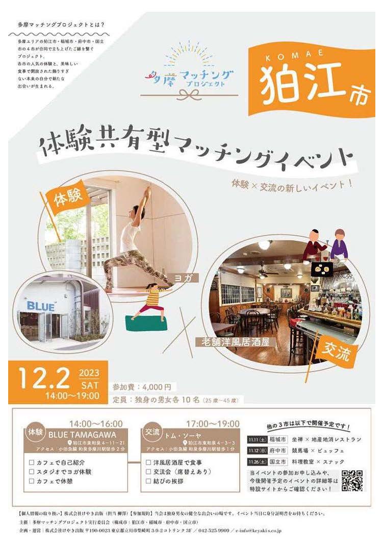 | 行事等の概要(掲載内容) | 詳細情報(PDF) ![]() 多摩マッチングプロジェクト、狛江市でのイベントです。BLUE TAMAGAWAでのヨガ体験後、老舗洋風居酒屋トムソーヤに場所を移し、食事を交えながらの交流会を行います。体験×交流のイベントで、狛江市の魅力をご堪能ください。 多摩マッチングプロジェクトでは、専用ホームページで「府中市、国立市、狛江市、稲城市」の魅力を発信しているほか、イベントや婚活等に役立つ情報を掲載していきます。 |