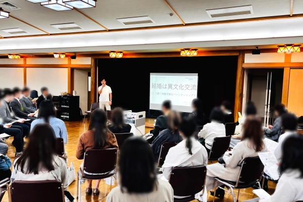 今年で13年目の開催となる12月(前半)の独婚祭は20代30代の独身者を対象に都立庭園「清澄庭園」の園内にある集会施設を会場に行われました。 第3部では、茨城大学の井上淳生先生をゲストにお招きして「結婚は異文化交流」をテーマとしたミニ講座と、社交ダンスインストラクターの資格を持つ同先生によるダンスエクササイズが行われました。 園内の紅葉がちょうど見頃を迎え、庭園内のグループ散策に交流タイムを経て、最後のカップリングでは合計7組のカップルが誕生しました。(第1希望者同士のみ) (参加者のアンケート結果は当会のホームページで公開しています。) |