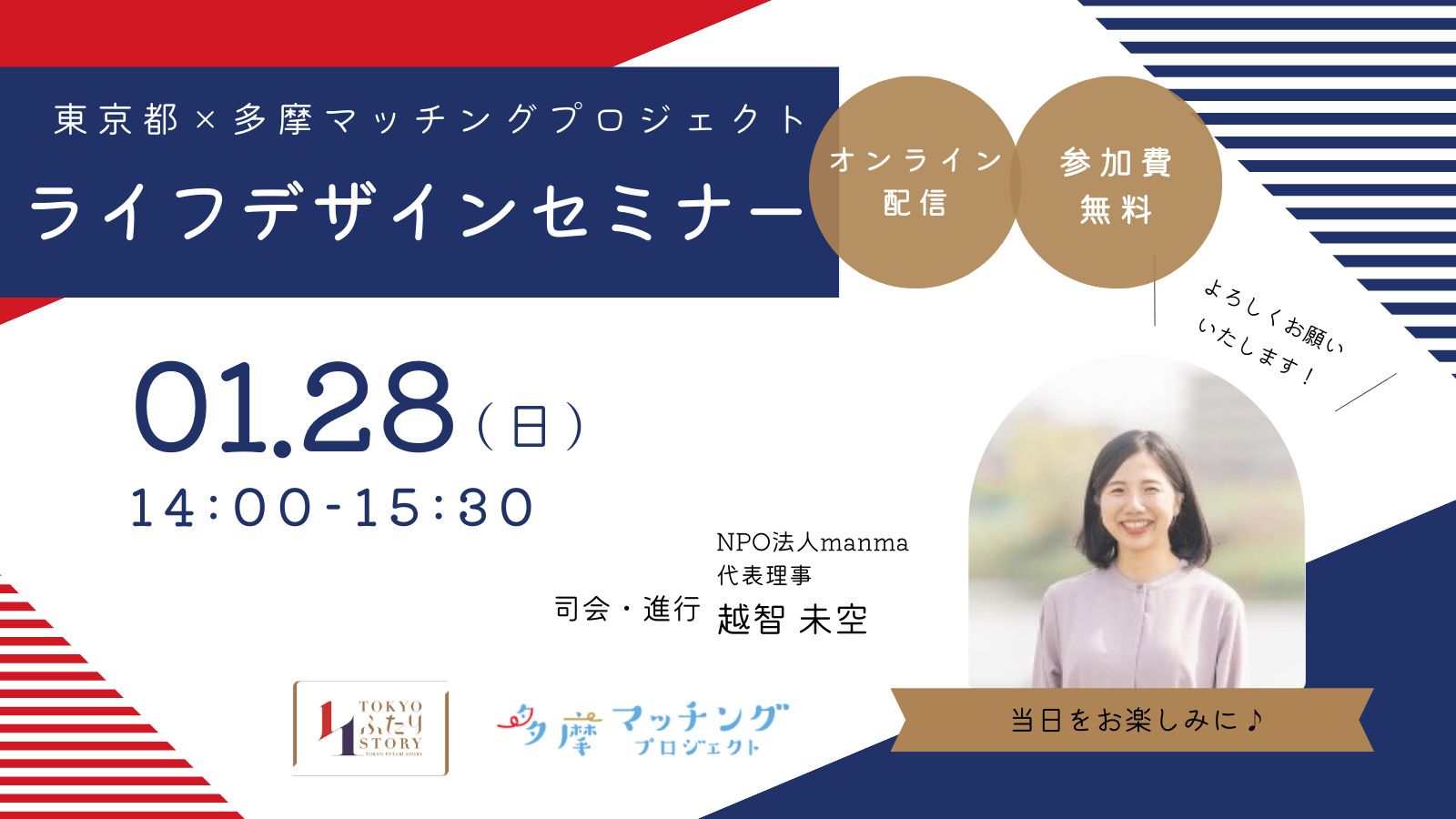 これから様々なライフイベントに向き合うみなさまに、結婚を含めたライフプランを考えるきっかけを提供するオンラインセミナーを開催します。 仕事、結婚、子育てなどの人生のイベントを踏まえて、多様な選択肢の中から自分らしいライフデザインを考えるきっかけにしてみませんか? 当日はゲストをお招きし、実際にライフイベントを経た方の声と併せてライフデザインに関する各種統計やデータ、東京都や狛江市・府中市・国立市・稲城市の多様な施策を紹介いたします。 |