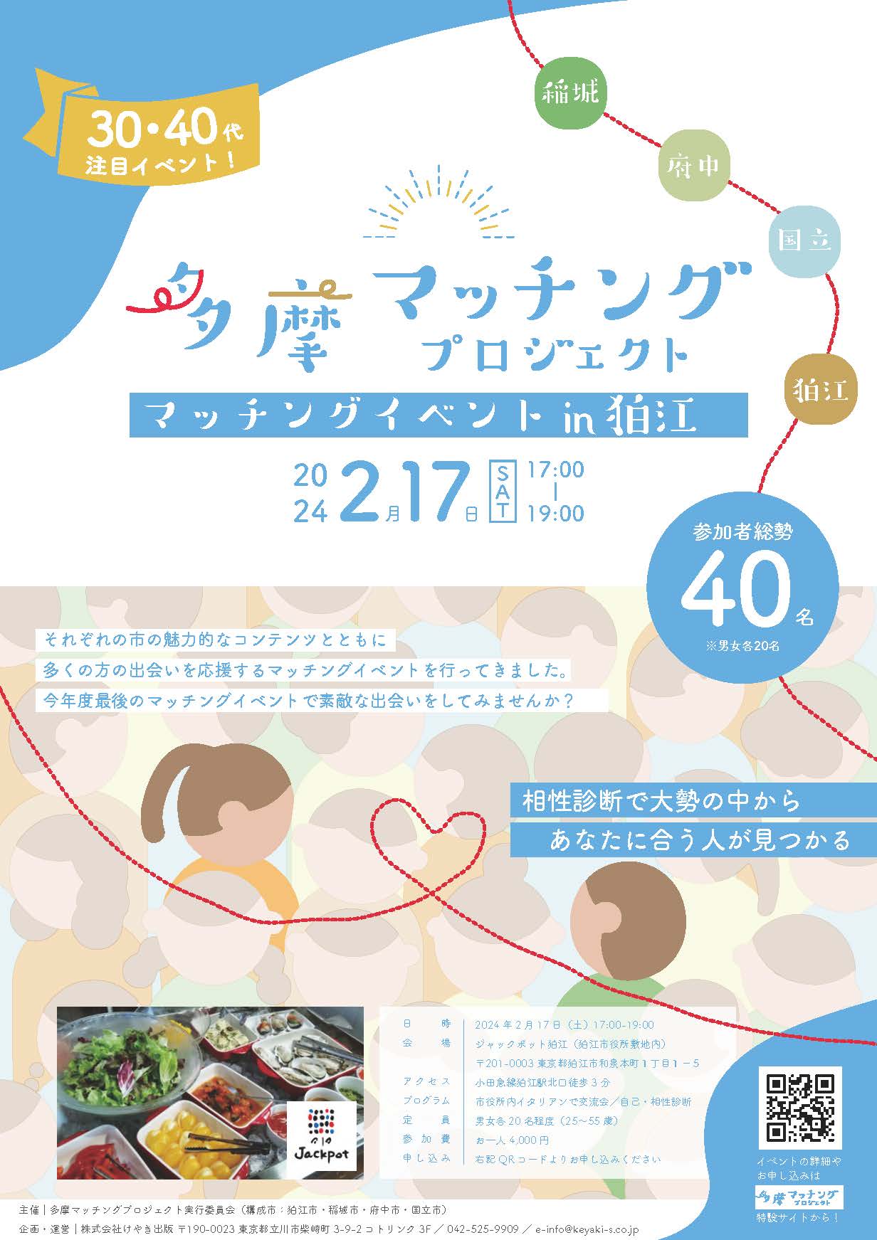 | 行事等の概要(掲載内容) | 詳細情報(PDF) ![]() 狛江市役所敷地内にある本格イタリアン「ジャックポット狛江」で、バラエティー豊かな創作料理とドリンクを楽しみながらのマッチングイベントです。イベント内でホロスコープを使った相性診断も行います。 多摩マッチングプロジェクトでは、専用ホームページで「府中市、国立市、狛江市、稲城市」の魅力を発信しているほか、イベントや婚活等に役立つ情報を掲載していきます。 |