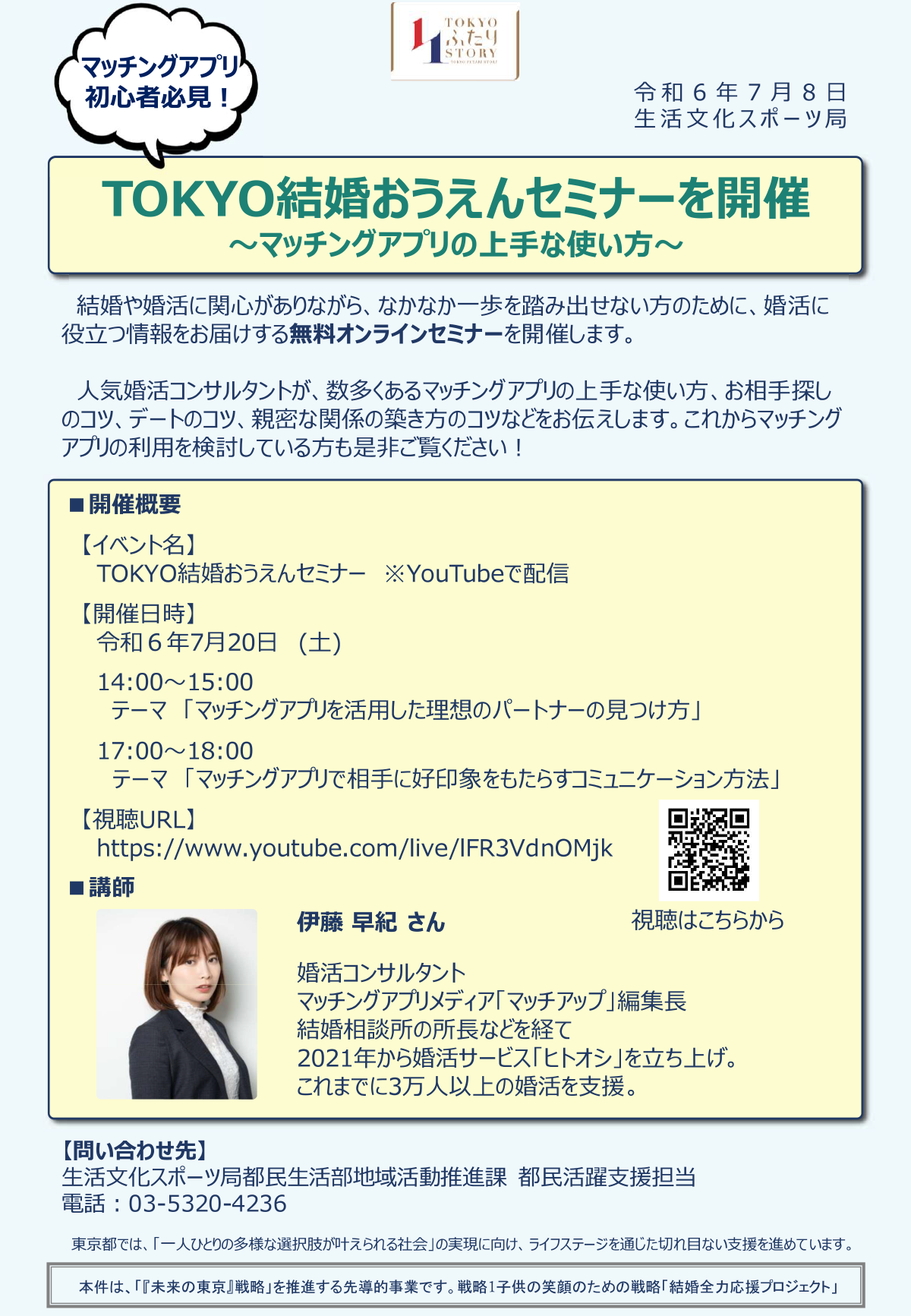 | 開催の趣旨・目的 | 結婚や婚活に関心がありながら、なかなか一歩を踏み出せない方のために、婚活に役立つ情報をお届けする無料オンラインセミナーを開催します。 | ||