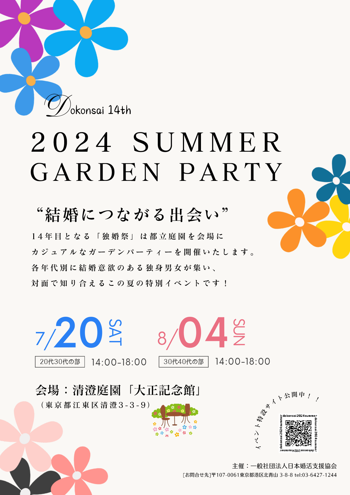 独婚祭 - 結婚につながる出会いを本気で応援する婚活イベント 「独婚祭」は、結婚を真剣に考えている独身者のための婚活イベントです。 この夏、東京都の名勝に指定されている日本庭園「清澄庭園」の園内にある集会施設を会場に、結婚意欲のある30代40代の独身者を対象に開催いたします。 |