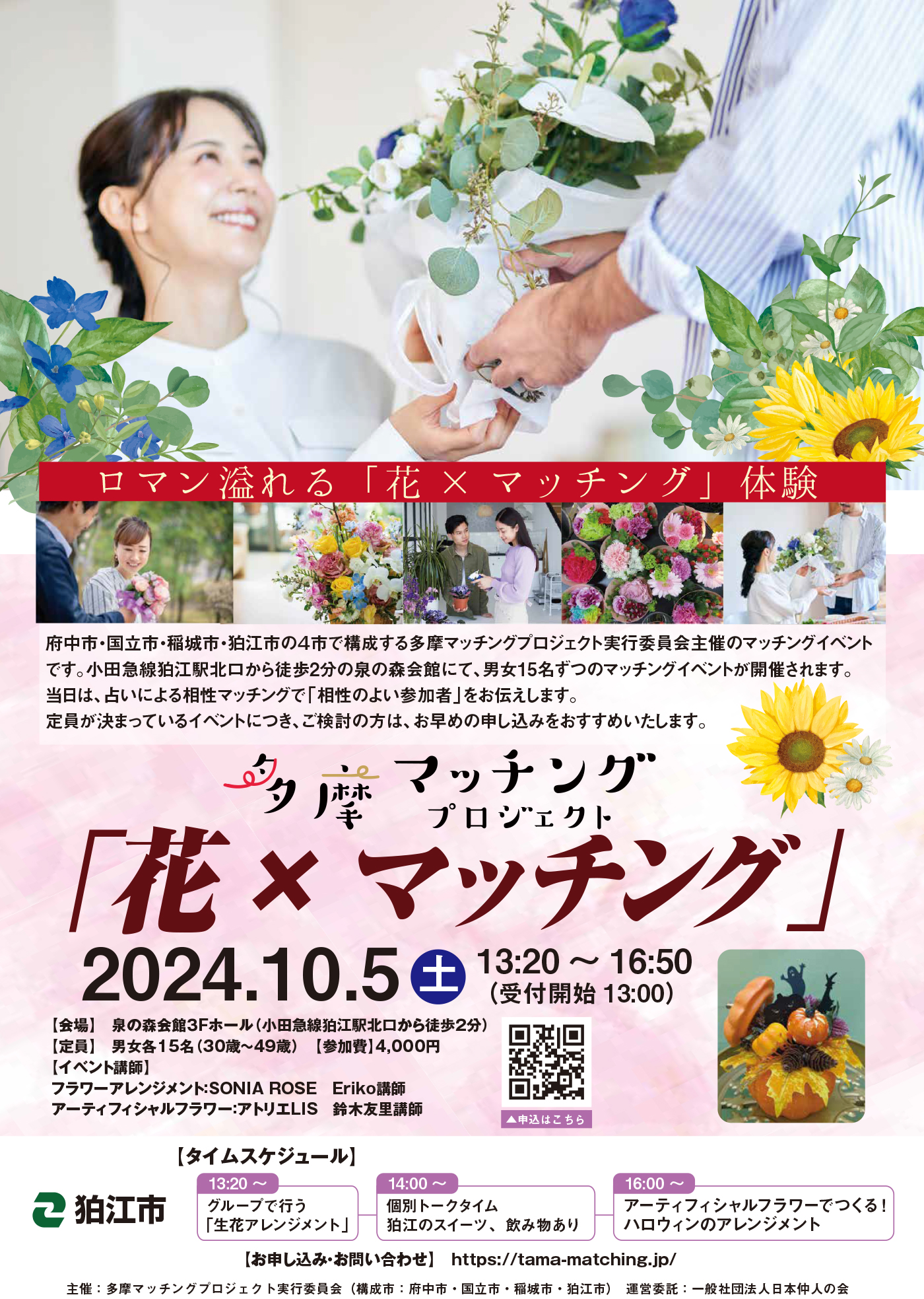 詳細情報(PDF) ![]() 狛江駅北口から徒歩2分の「泉の森会館」で、フラワーアレンジメント体験を楽しみながらのマッチングイベントです。イベント内では、相性診断も行います。 多摩マッチングプロジェクトでは、専用ホームページで「府中市、国立市、狛江市、稲城市」の魅力を発信しているほか、イベントや婚活等に役立つ情報を掲載していきます。 https://tama-matching.jp |