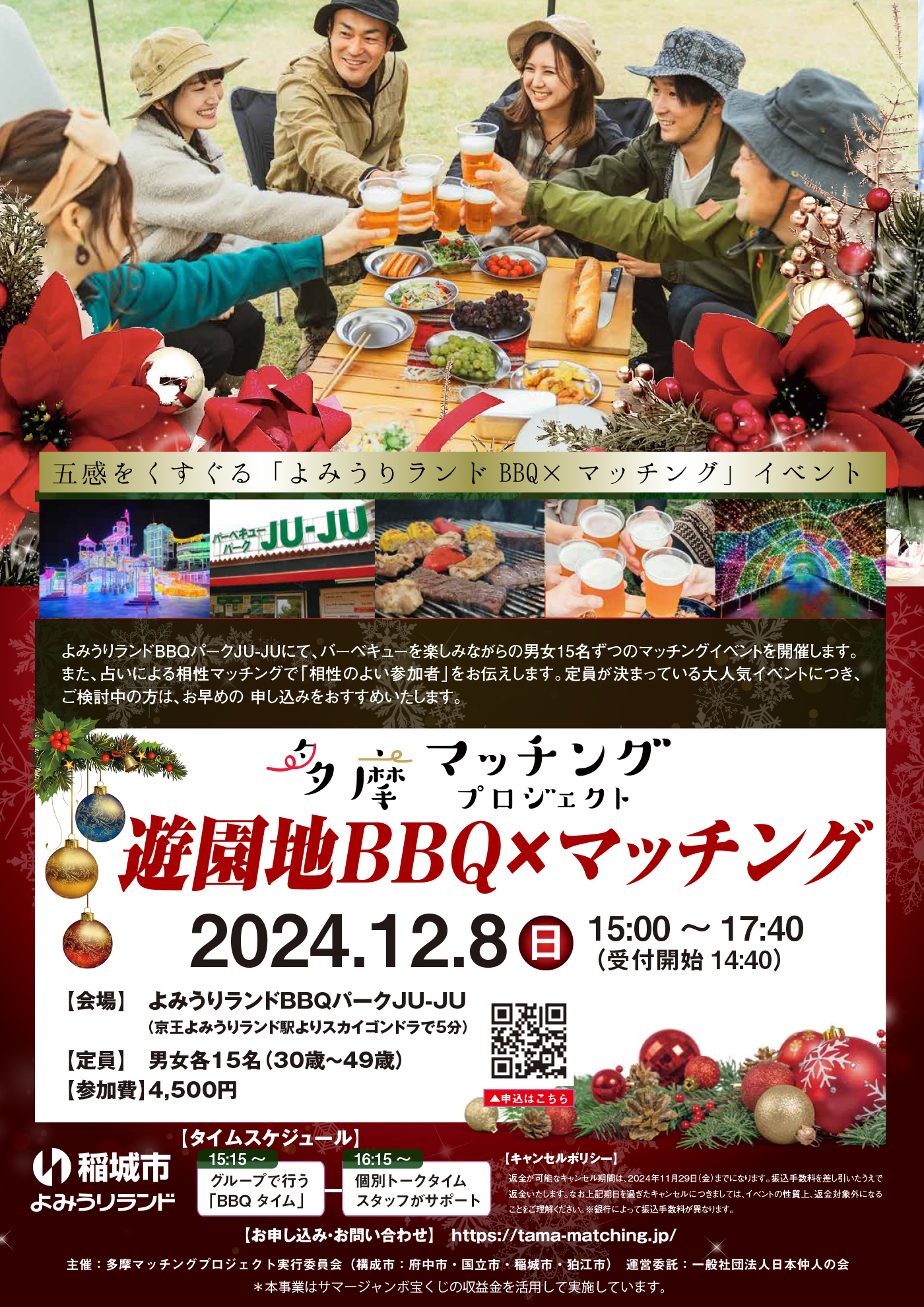 詳細情報(PDF) ![]() よみうりランドのBBQパークで、バーベキューを味わいながらのマッチングイベントです。イベント内では、相性診断も行います。 多摩マッチングプロジェクトでは、専用ホームページで「府中市、国立市、狛江市、稲城市」の魅力を発信しているほか、イベントや婚活等に役立つ情報を掲載していきます。 https://tama-matching.jp |