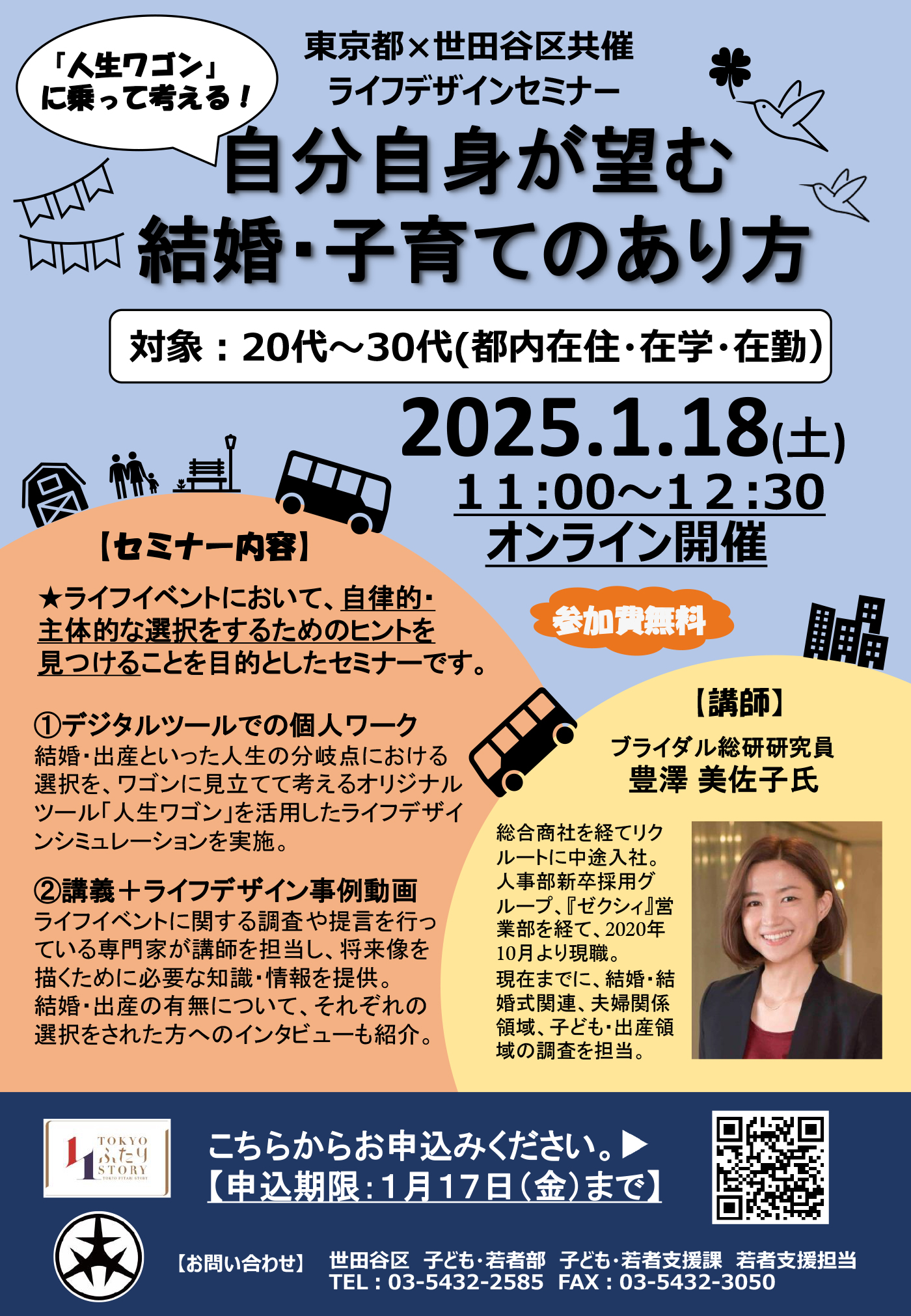 | 開催の趣旨・目的 | ライフイベントにおいて、自律的・主体的な選択をするためのヒントを見つけることを目的としたセミナーです。 | ||