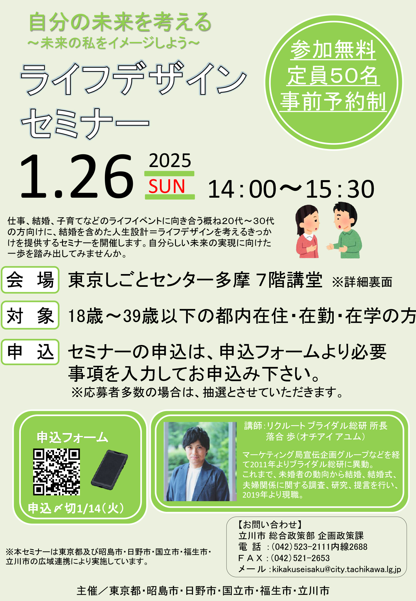 | 開催の趣旨・目的 | 仕事、結婚、子育てなどのライフイベントに向き合う概ね20代~30代の方向けに、結婚を含めた人生設計=ライフデザインを考えるきっかけを提供するセミナーを開催します。自分らしい未来の実現に向けた一歩を踏み出してみませんか。 | ||