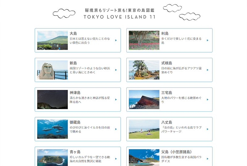 サイトでは、東京の島しょ地域11島(大島、利島、新島、式根島、神津島、三宅島、御蔵島、八丈島、青ヶ島、父島、母島)の基本情報や各島の縁結びスポット、島を舞台にした縁結び動画、さらにはグルメや観光スポット、アクティビティなど、島旅デートにおすすめのスポットなども紹介しています。