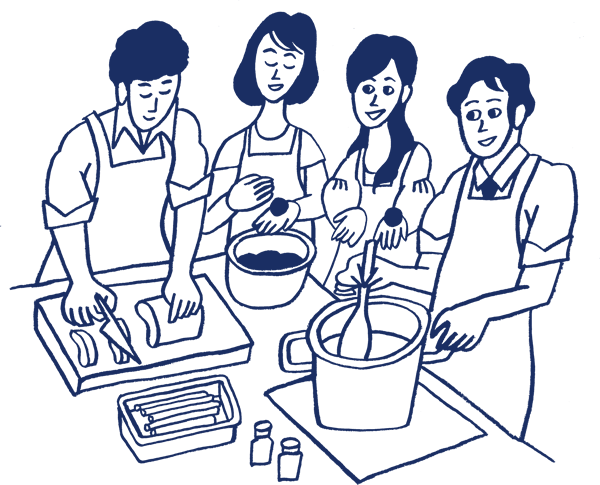 完成したら、盛り付けをして試食。試食時間がフリータイムを兼ねており、自由な席に座って作った料理を食べます。ただ、料理を通して参加者同士が打ち解けたようで、チームごとに楽しそうに試食する姿が印象的でした。参加者に感想を伺ったところ、「作業を一緒にすると自己紹介だけではわからなかった相手のいいところが見えてくる」「料理を通して相手のちょっとした思いやりがわかる」など、共同作業を通して距離がさらに縮まったようです。