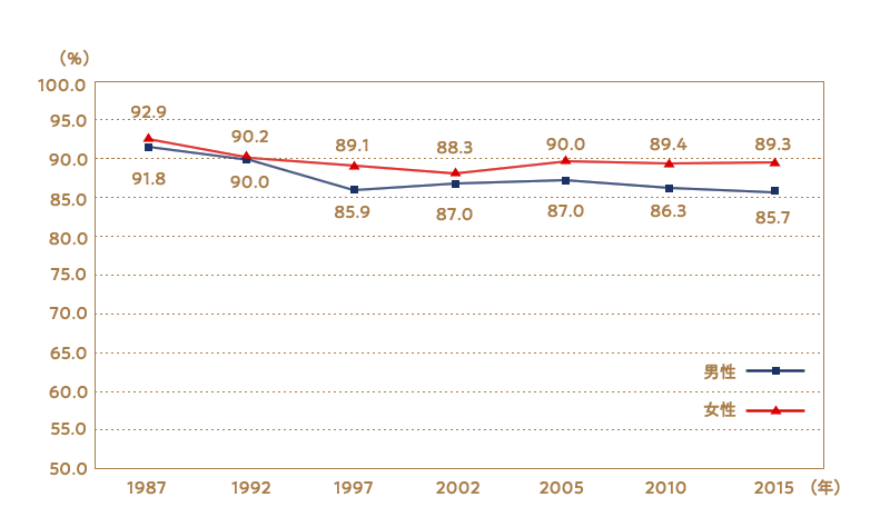 国立社会保障・人口問題研究所の「第15回出生動向基本調査」によると、18~34歳の未婚者のうち、男性の86%、女性の89%が「いずれ結婚するつもり」と回答しています。しかもこの割合は、1980年代からほぼ変わらずに推移しているといいます。要するに、30年前も今も変わらず、18~34歳の未婚男女の約9割がいずれ結婚しようと考えているのです。