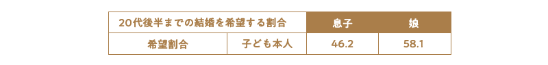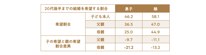 図:20代後半までに結婚したい(親:してほしい)割合比較表(%)