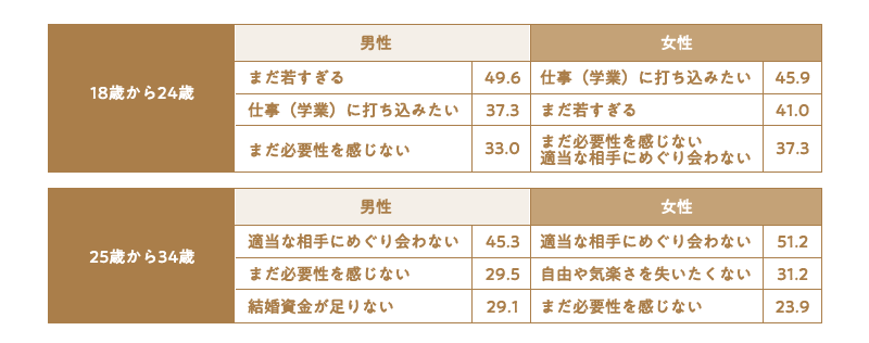 実際、第15回出生動向基本調査では、まだ結婚しない理由として、18歳から24歳では男女とも「まだ若すぎる」「仕事(学業)に打ち込みたい」が上位にきているのに対し、25歳以上になると男女とも「適当な相手にめぐり合わない」がほかの回答を制して圧倒的なトップ回答となっています。
