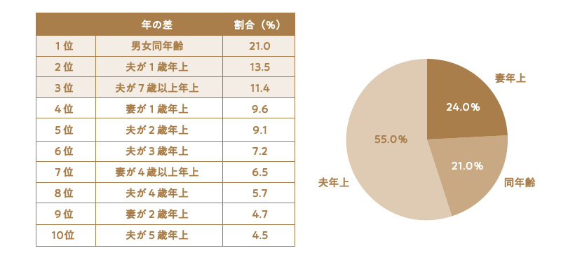 しかし、実際に結婚しているカップルには、こうした親世代とは異なる価値観でパートナー選びをする人も多くいます。2015年に婚姻届を提出した初婚夫婦の年齢差をみると、4分の1にあたる24%のカップルにおいて、妻のほうが年上でした。また、夫が年上であるケースは55%と確かに過半数を占めているものの、4組に1組は女性が年上で、同じ年齢同士の婚姻件数よりも多いため、年上妻はもう珍しいケースとはいえない時代となっているのです。
