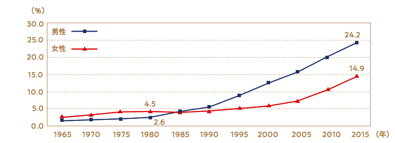 一方、50歳の男女のうち結婚歴がない人の割合は、男性で24.2%、女性で14.9%といずれも過去最高を記録しています(2015年国勢調査)。1980年代まではほぼ横ばいだったこの数値は、1990年代から右肩上がりに上昇しています。