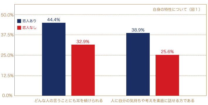 1つめは「伝え上手、聞き上手」です。具体的に「どんな人の言うことにも耳を傾けられる」「人に自分の気持ちや考えを素直に話せる方である」といった項目は、「恋人がいない層」と比べそれぞれ約12ポイント、13ポイントの差が出ており(図1)、恋人がいる人の特徴になっています。恋愛は他者との人間関係づくりでもあり、いわゆるコミュニケーションでもあります。そのため、伝えない、あるいはあまり話を聞かないということでは関係が構築できません。また、一方的に話しすぎても、聞きすぎても、バランスが崩れます。あくまで伝えることと聞くことのバランスが取れる人、その中で相手のことを深く知り、自分を知ってもらい、関係を構築することが、恋人づくりに大きく関係しています。