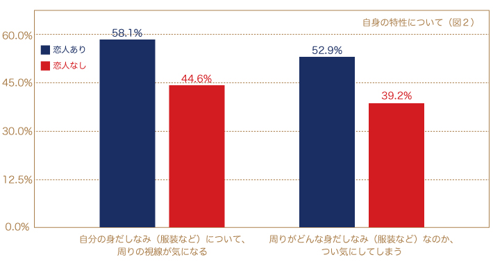 3つ目は「容姿と中身」です。現在、恋人に求める要素として「人柄の良さ」が79.7%と最も割合が高く、「容姿」は47.2%と比較的高くありません。外見重視と内面重視の選択でも多くは内面重視と答えます。しかし、ここで難しい問題があります。内面はなかなか見えづらいということです。ですので、内面を磨くことに加えて相手に分かりやすく伝わるもの、つまり「印象」を高めることも重要です。「印象」は瞬時にその人の評価につながりやすいもので、その為にも、比較的自身でコントロールできる「身だしなみ」を整えておくことが大切になります。実際に、「自分の身だしなみについて、周りの視線が気になる」割合や、「周りがどんな身だしなみなのか、つい気にしてしまう」割合は、恋人がいる層の方が約14ポイント高く(図2)、恋人がいることと関係があると言えます。