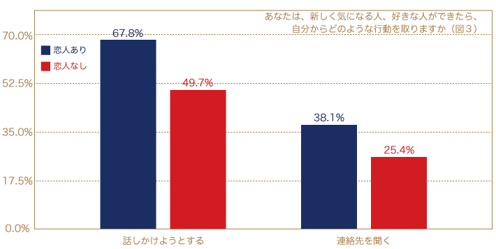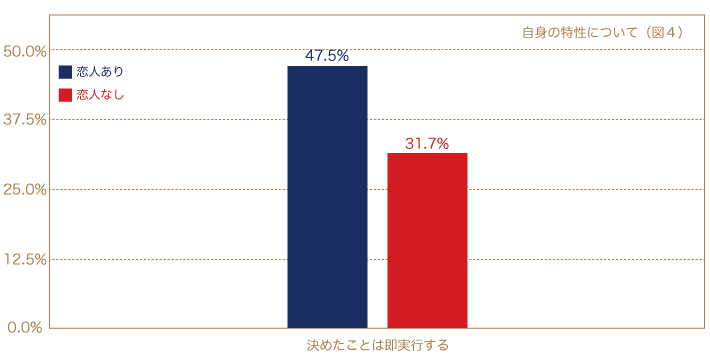 そして最後の5つめは「行動」です。自由な恋愛において、恋人がいる人が共通で実行していることがあります。それは「伝える」ということです。自分の思いや考え、気持ちを何かしらの手段で届けています。その意思表明がないと交際にはならず、心の中で思っているだけでは伝わることはありません。言い換えれば「思考を巡らす」だけでは進むことはなく、「行動」して初めて進むのが恋愛だと言えるかもしれません。実際にデータを見ても、恋人がいる人はいない人に比べ、気になる人ができたら「話しかけようとする」「連絡先を聞く」などの割合が、それぞれ約18ポイント、13ポイント高く(図3)、「行動」することを念頭に置いていることが分かります。また、「決めたことは即実行する」という割合も約16ポイント高く(図4)、日常的に「行動」を心がけていると言えます。もちろん、いきなり意中の人に伝えるという「行動」はハードルが高いです。ですので「友人に恋人がほしいと言う」「身だしなみを整えるために洋服を買う」などどんな些細なことでもいいと思いますが、「行動」を念頭に置き、小さなことから始めてみることが重要だと思います。