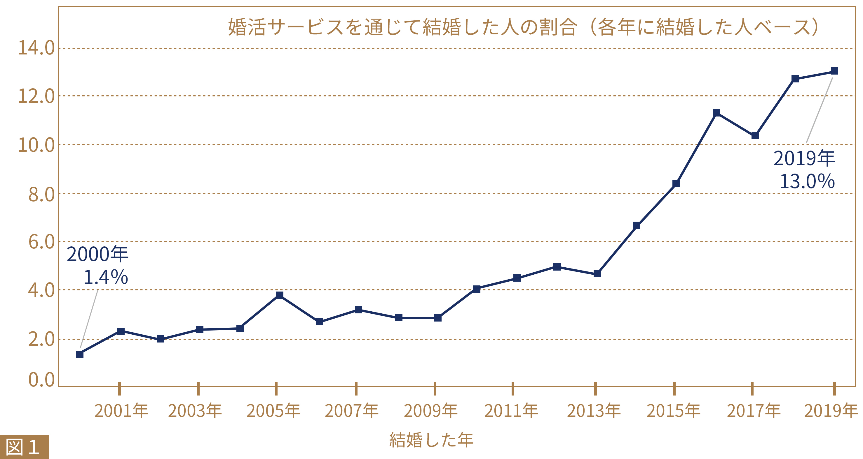 2019年に結婚した人のうち、婚活サービスを通じて結婚した人の割合は過去最高の13.0%に達しました。これは年間の結婚した人のうち、約8人に1人以上の方が婚活サービスを通じて結婚したことになり、調査開始以降、過去最高の数値となっています。浸透スピードが早いことも特徴的で、2013年以降は一気に上昇し、ここ数年の定着が目覚ましいです。2000年には1.4%だった状況と比べると、約20年で市場が大きく広がり、結婚に向けた有効な手段になったと言えるでしょう(図1)。また、独身者の利用についても利用経験率は増加傾向で、20代~40代の恋愛もしくは結婚意向がある恋人のいない独身者において、婚活サービスの利用経験割合は25.5%と、調査開始以降最高になっています(図2)。特にネット系婚活サービス利用経験割合は、2016年の9.8%から2019年は19.1%と伸長し、全体を大きく底上げしています。