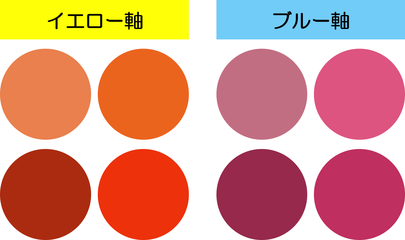 ・コーラル、オレンジやオレンジベージュ、黄みレッド系なら「イエロー軸」