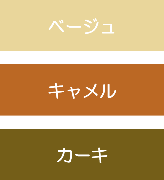 ベージュ(イエローがかった色がおすすめ)、キャメル、カーキの3色を味方にしてください。