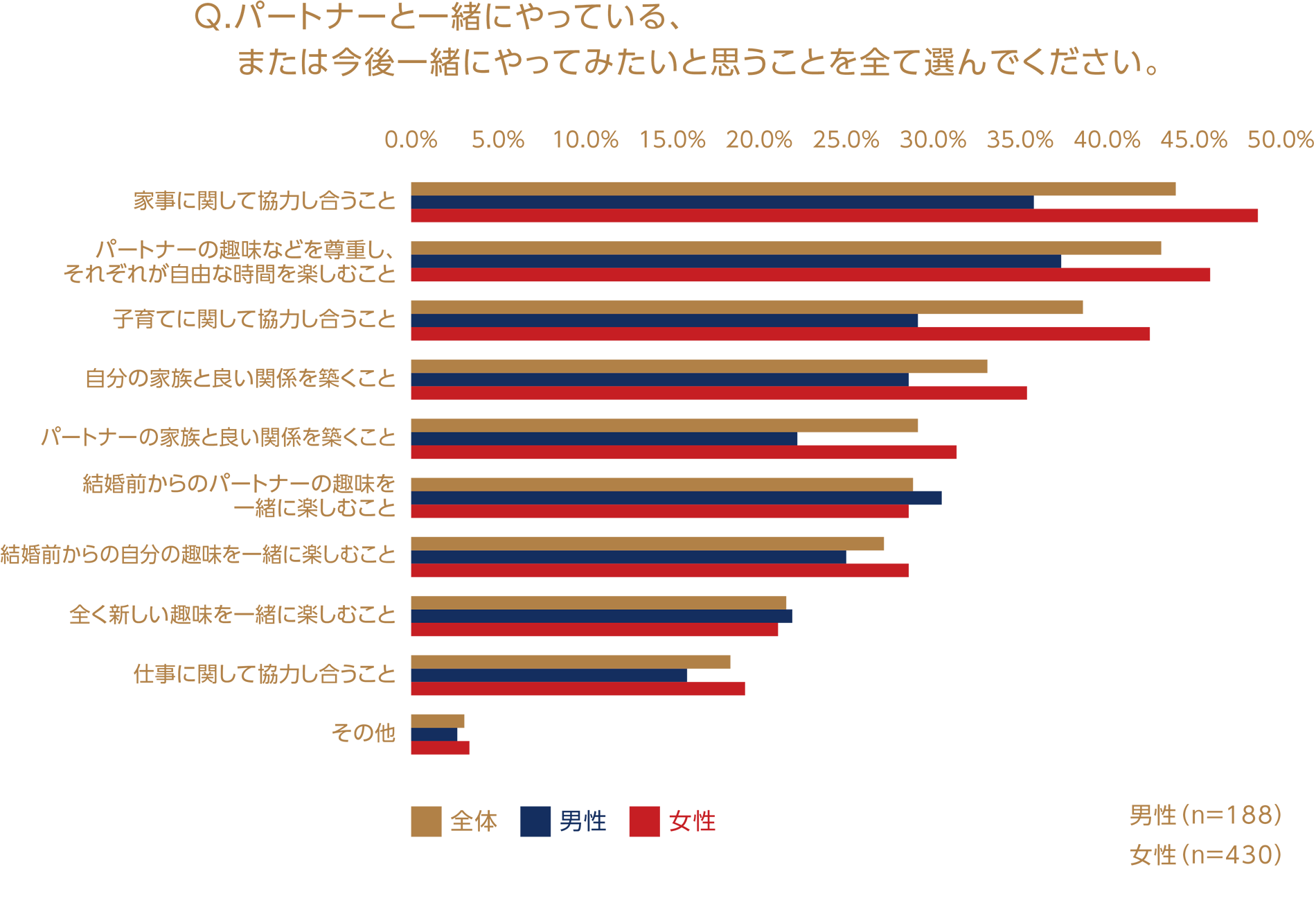 続いて、「パートナーと一緒にやっている、または今後一緒にやってみたいと思うこと」について見てみると、このような結果になりました(複数回答可の選択式)。