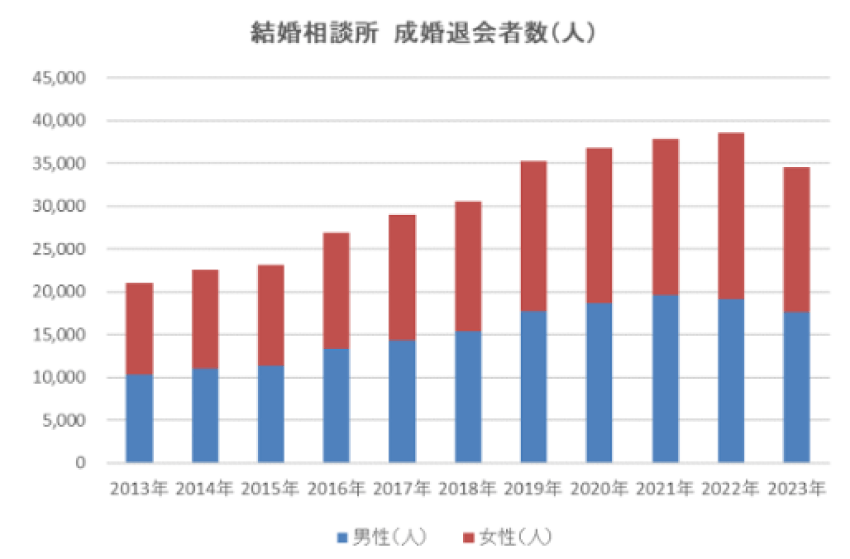 結婚相談所で出会って結婚した人は、年々増加し、2023年は年間3万5000人が会員同士で成婚退会されました。