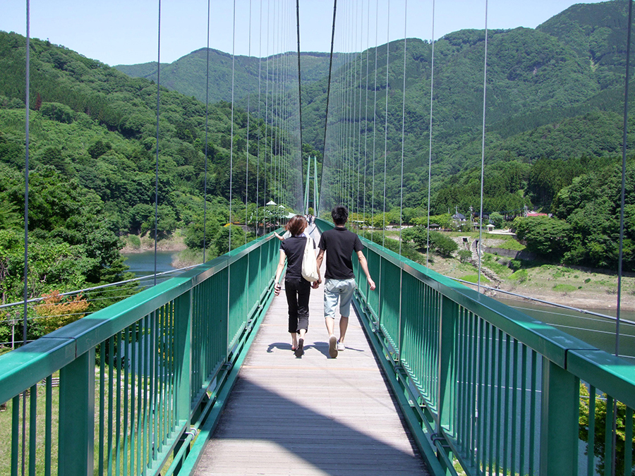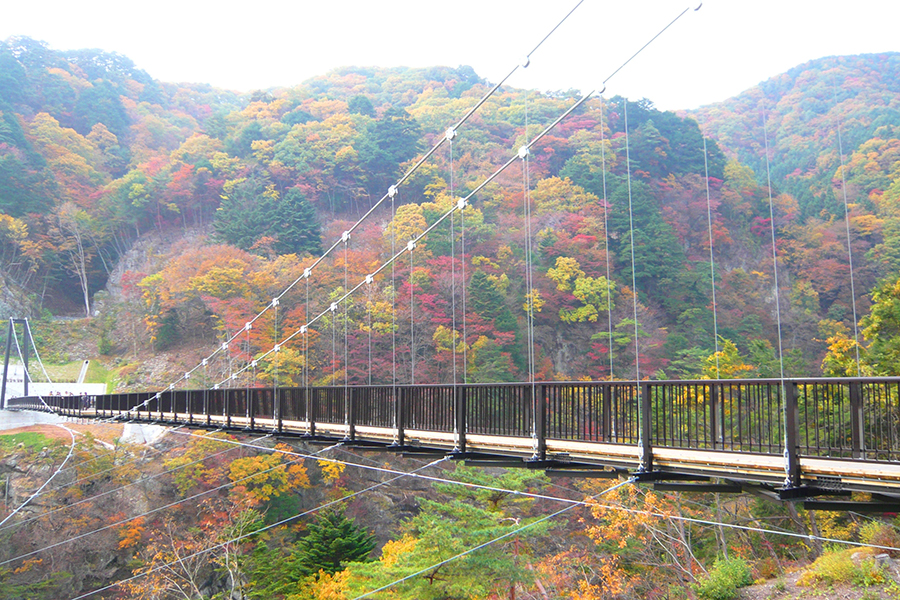 吊橋を囲む雄大な塩原渓谷は、訪れた人を新緑・紅葉・雪化粧など四季折々の美しい景観で迎えてくれます。360度の大パノラマに加えて、全長320メートルの吊橋から足元を見下ろせばきらきらと光る水面がロマンティック。