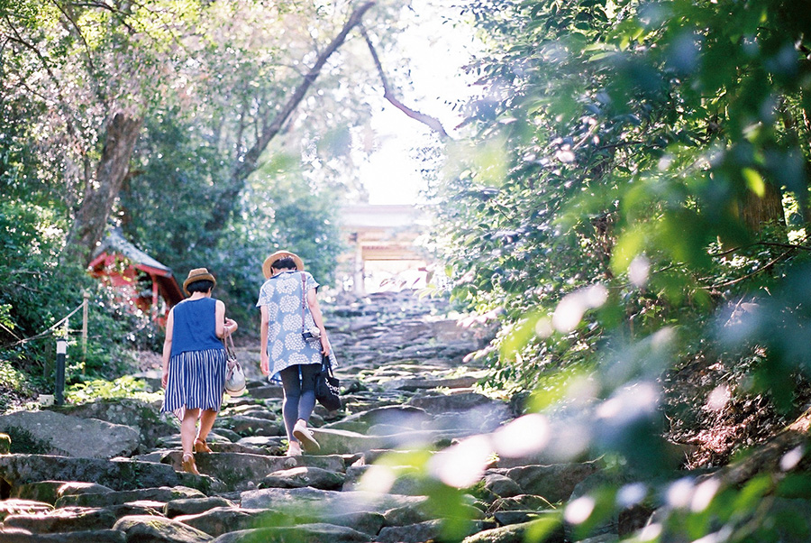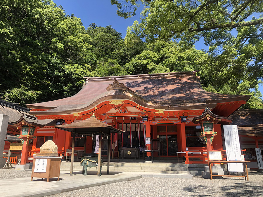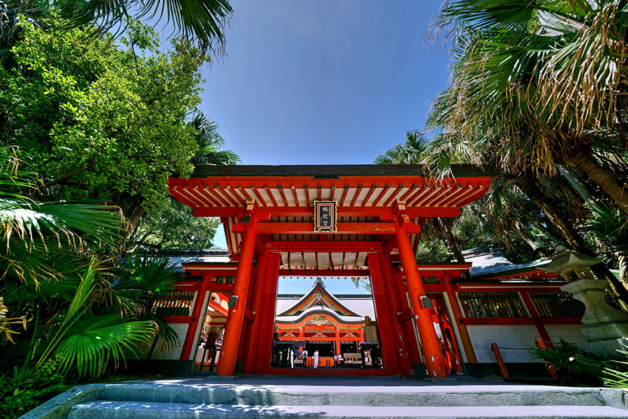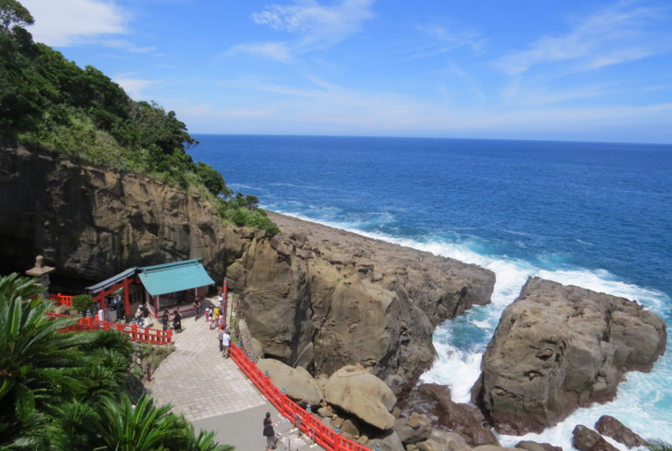 海岸線沿いにある鵜戸神宮は、神武天皇の母親を祀る神社で、安産祈願や縁結び祈願に訪れる人が多いです。崖下の亀岩めがけて投げる運玉で運試しも。途中にも縁結びスポットが複数あります。