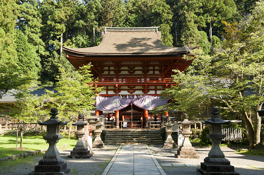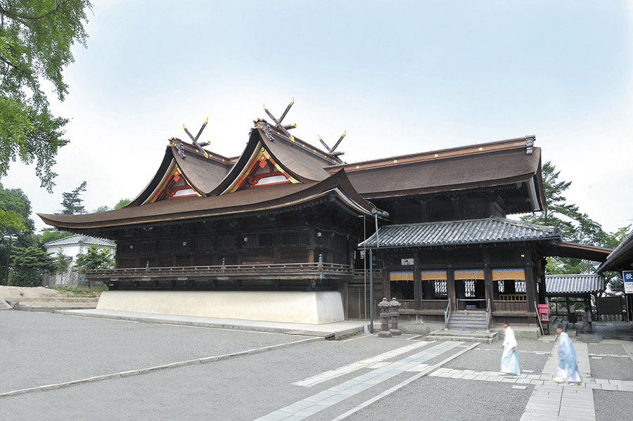 大吉備津彦大神を主祭神とする山陽道屈指の大社です。本殿は入母屋の千鳥破風を前後に二つ並べ、同じ高さの棟で結んでひとつの大きな屋根にまとめた国内唯一の構造で、比翼入母屋造(ひよくいりもやづくり)と呼ばれています。吉備津神社でしか見られないこの特殊な造りは、夫婦が仲睦まじく寄り添っている様子を表しているともいわれています。また、吉備津彦命の妻である百田弓矢比売(ももたゆみやひめ)が共に祀られていることから、縁結びや夫婦円満にご利益があるといわれています。