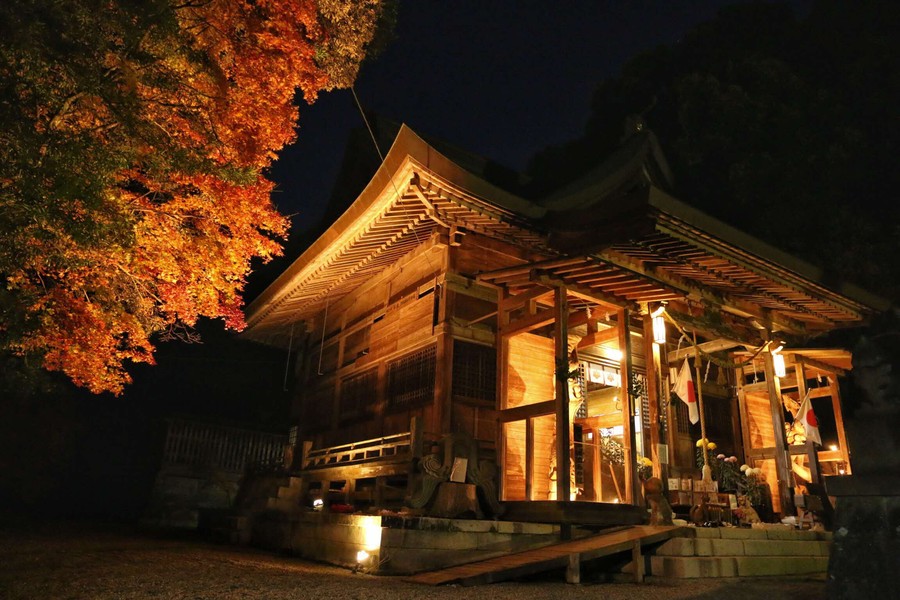 里宮神社は縁結びの神様といわれる彦火火出見尊(ひこほほでみのみこと)を祀っていることから、縁結びの御利益のある神社です。さらに、市房山神宮里宮神社秋季例大祭が開催される時期は、紅葉が綺麗に色付き、タイミングがよければライトアップも見れるかもしれません!また、前夜祭では、湯前町の中学生たちが伝統芸能の継承のひとつ、「球磨神楽」を奉納します。幻想的な雰囲気が生まれる空間でのひとときをお過ごしください!!