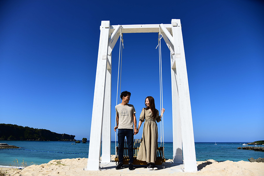 恩納村海浜公園ナビービーチは、家族で楽しめる村営のビーチ。2020年11月22日に誕生した『祝福の鐘』と『Nabi Swing』の2つのオブジェは、ウェディングでも、家族でも、お友だち同士の撮影でも、映えること間違い無し!