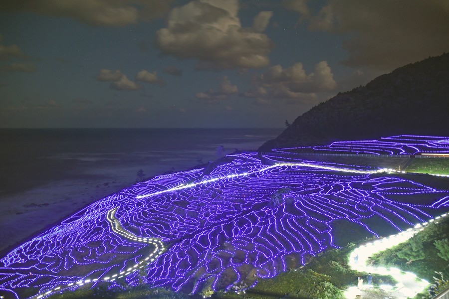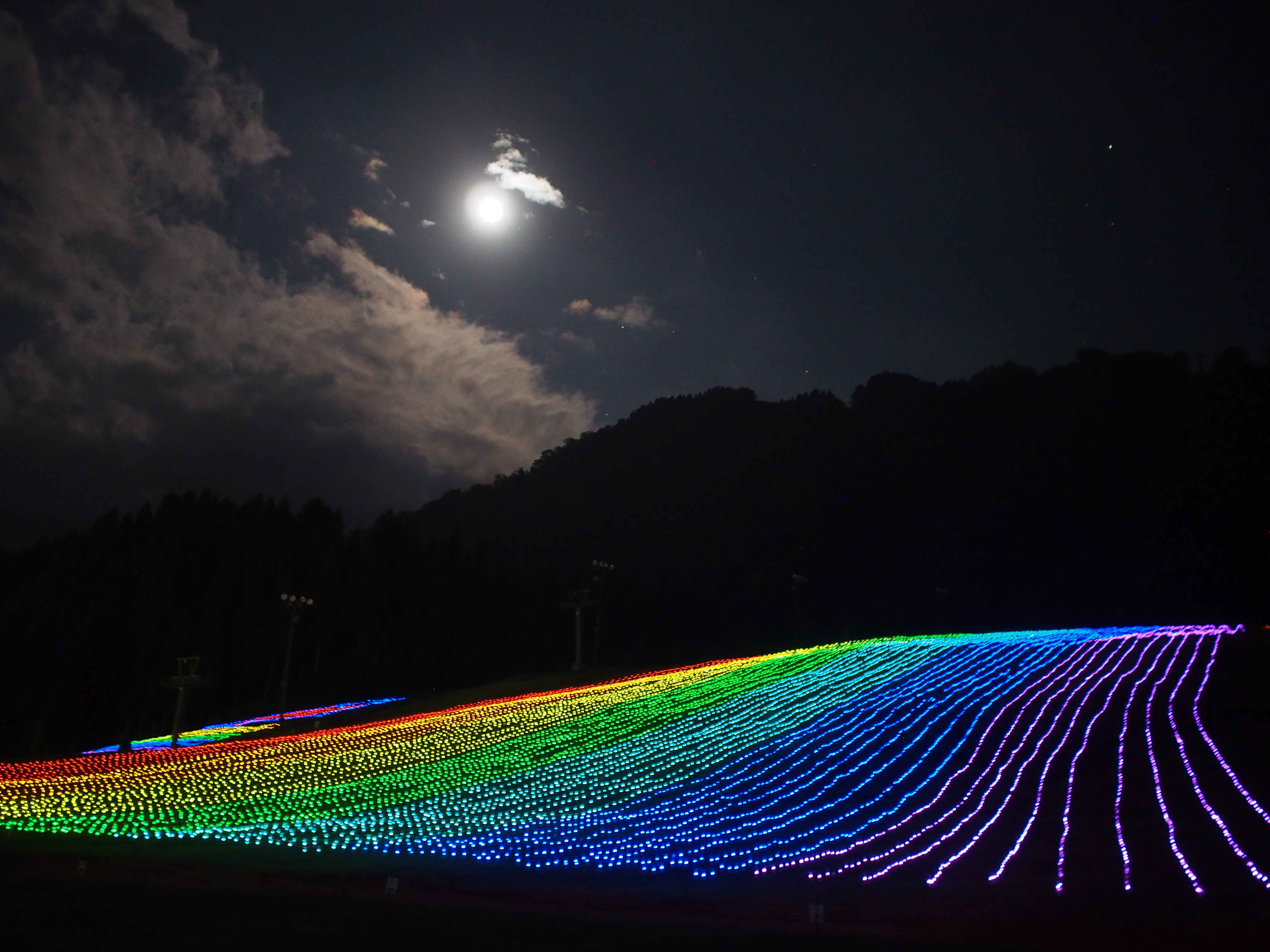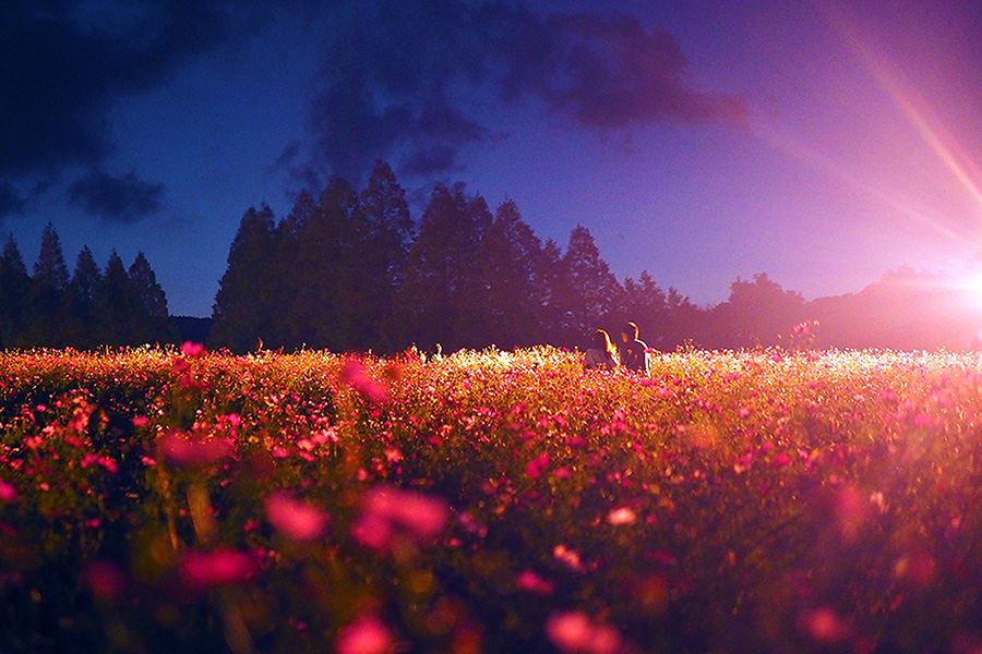 漆黒の夜空に輝く星とあぜを彩るイルミネーションの優しい光のコラボレーションが二人を優しく包み込みます。