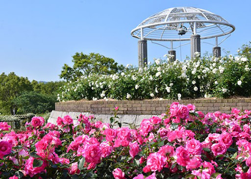 800種5,000株のバラが色とりどりに咲き誇ります。300m続くバラの壁やバラの宮殿など展示方法にも工夫を凝らし、訪れた方を楽しませてくれます。またバラの浮かぶ池、園内を一望する展望所など、写真撮影スポットがたくさんあります。造園の美しさや手入れの良さも人気の秘密です。