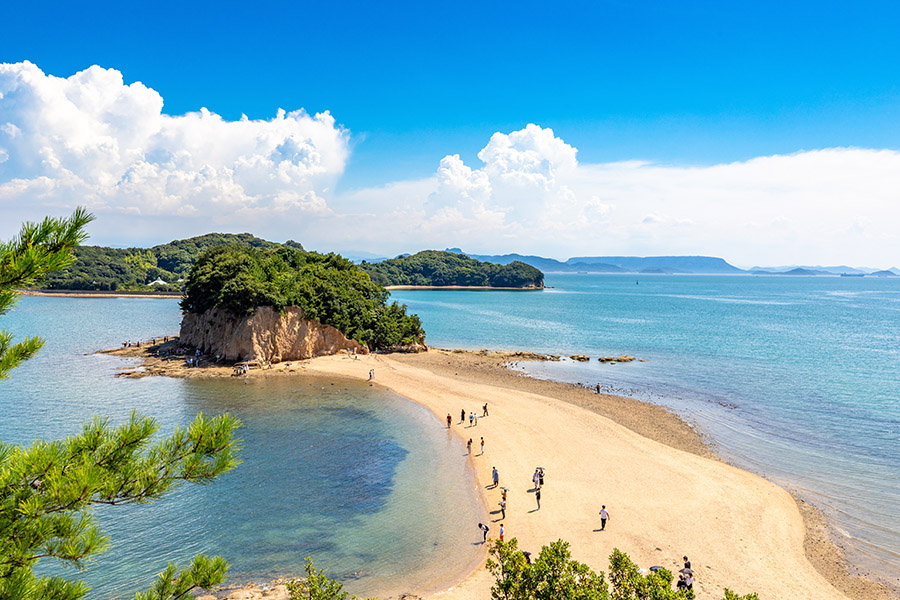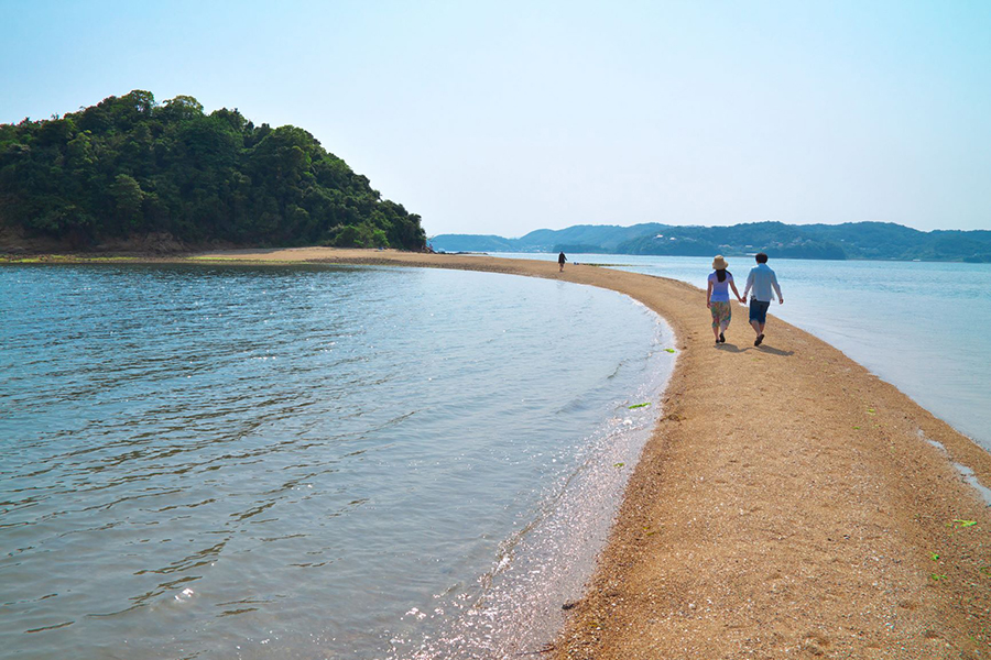 瀬戸内市牛窓沖に浮かぶ黒島では、潮がよく引く干潮時にロマンチックな砂の道が現れます。3つの島が弓形につながった黒島ヴィーナスロードは恋人たちのパワースポット。自然が作り出す神秘的な全長800mの砂の道を歩いて2人で触ると恋愛が成就すると言われる「ハートの石」を探してみてください
