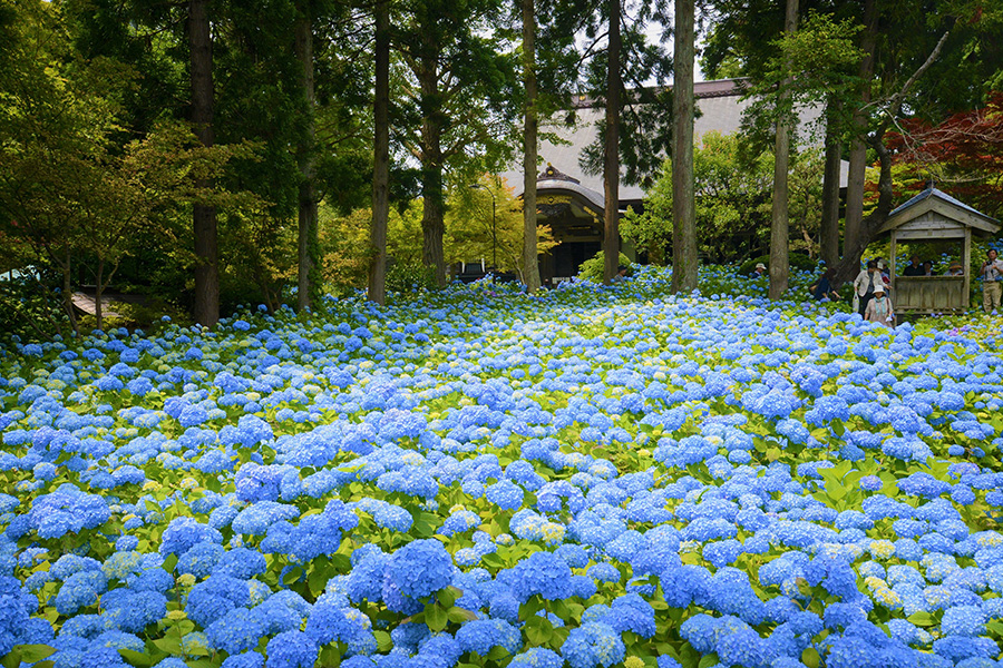 秋田県男鹿市の雲昌寺は、境内に1,500株ものあじさいが咲き誇る絶景スポット。境内を埋め尽くす青いあじさいの奥には男鹿の海が望めるほか、涼しげな竹林やあじさいの花を浮かべた手水鉢など、撮影スポットが数多くあります。