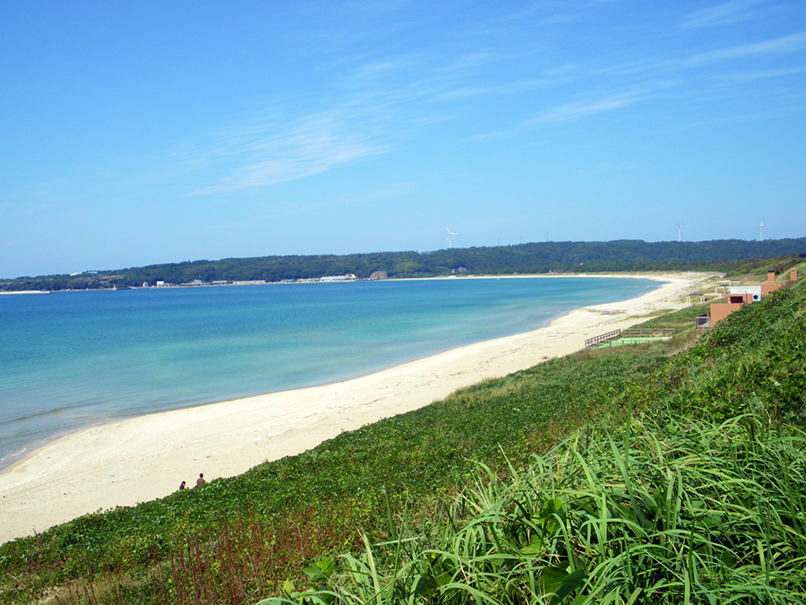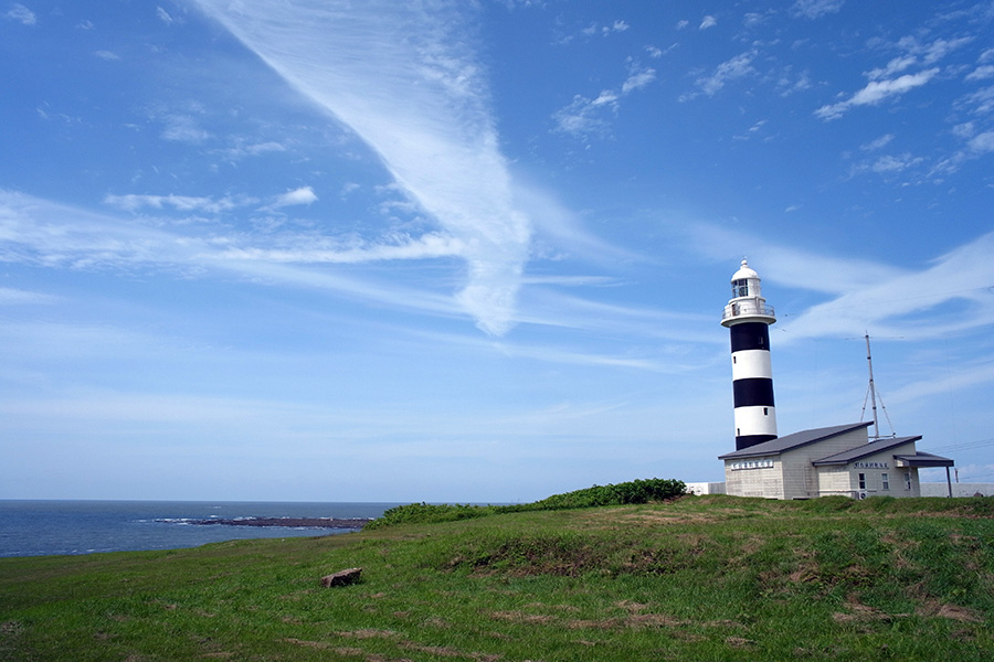 入道崎は、北緯40度ラインに位置する絶景スポットです。見るものを魅了する緑の大地、青い海、空の絶妙なコントラスト。一面に広がる芝生の上で、パノラマ上に広がる海を見ながら穏やかなひと時をお過ごしください。入道崎の象徴でもある入道崎灯台は、白黒の縞模様が印象的で、「日本の灯台50選」や「恋する灯台」にも認定されています。