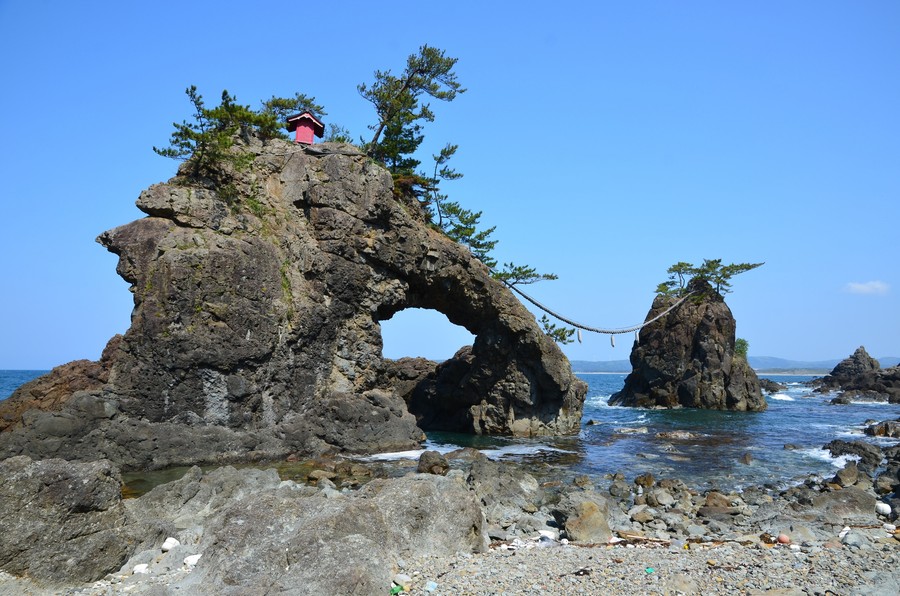 海の中に2つの岩が寄り添うように立っていることから夫婦岩(めおといわ)とも呼ばれています。お天気の良い日はオレンジの夕景に岩のシルエットが浮かび、ふたりの記念撮影にもおすすめの場所です。また、付近の「増穂浦海岸」では、幸せを呼ぶ貝と呼ばれる「さくら貝」を拾うことができるので、ぜひお二人で見つけてみてください。