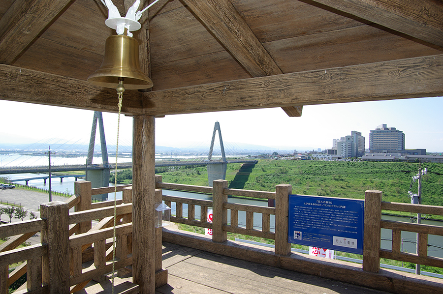 「幸せへの鐘」や「ダブルハート」がある見晴らし台は、西に爽やかな潮風が気持ちよい内灘海岸、東には野鳥の楽園である河北潟、快晴の日には立山連峰から白山まで見渡せる360度絶景のスポットです。