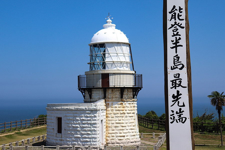 七尾湾の入口にあたる観音崎に立つ灯台。岬は、富山湾を挟んで立山連峰を眺めることができる隠れた絶景ポイント。何よりの魅力は周囲の海。能登半島に囲まれているため波が穏やかで透明度が高く、開放的なブルーの色合いを生じさせる。野生のイルカやウミホタルなども見ることができ、ロマンティックな海からのギフトを楽しめるスポット