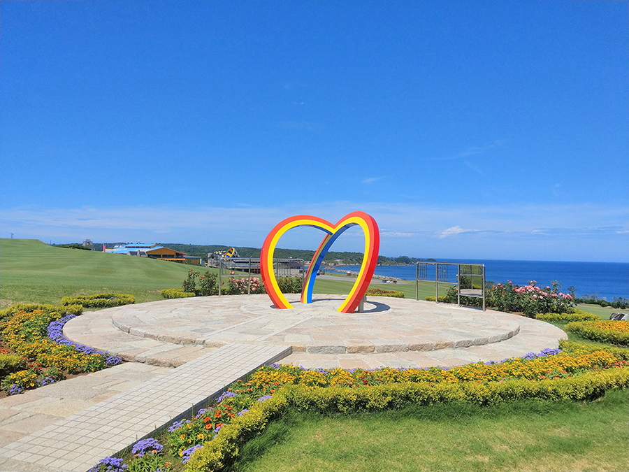 芝政ワールドは日本海に面した自然豊かなロケーションのテーマパークで、2018年に「恋人の聖地」に選定されました。日本の夕日百選に選ばれた東尋坊からも近く、丘の上に建つモニュメントからは、日本海に沈む美しい夕日を望むことができます。